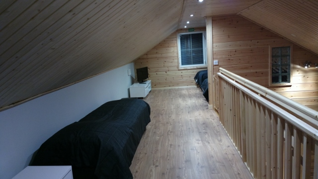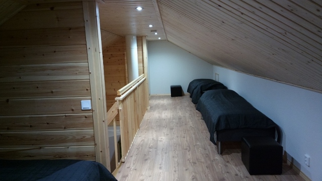 Korkea parvi, jossa 4 runkopatjasänkyä.