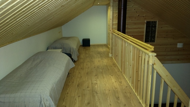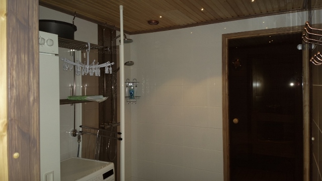 Tupakeiitiö, kaakelitakka, sauna, pesuhuone, 2 wc, ulkovarasto, terassi, alakerrassa kaksi makuuhuonetta, joissa kummassakin 2 runkopatjasänkyä vierekkäin. Saa myös erikseen.